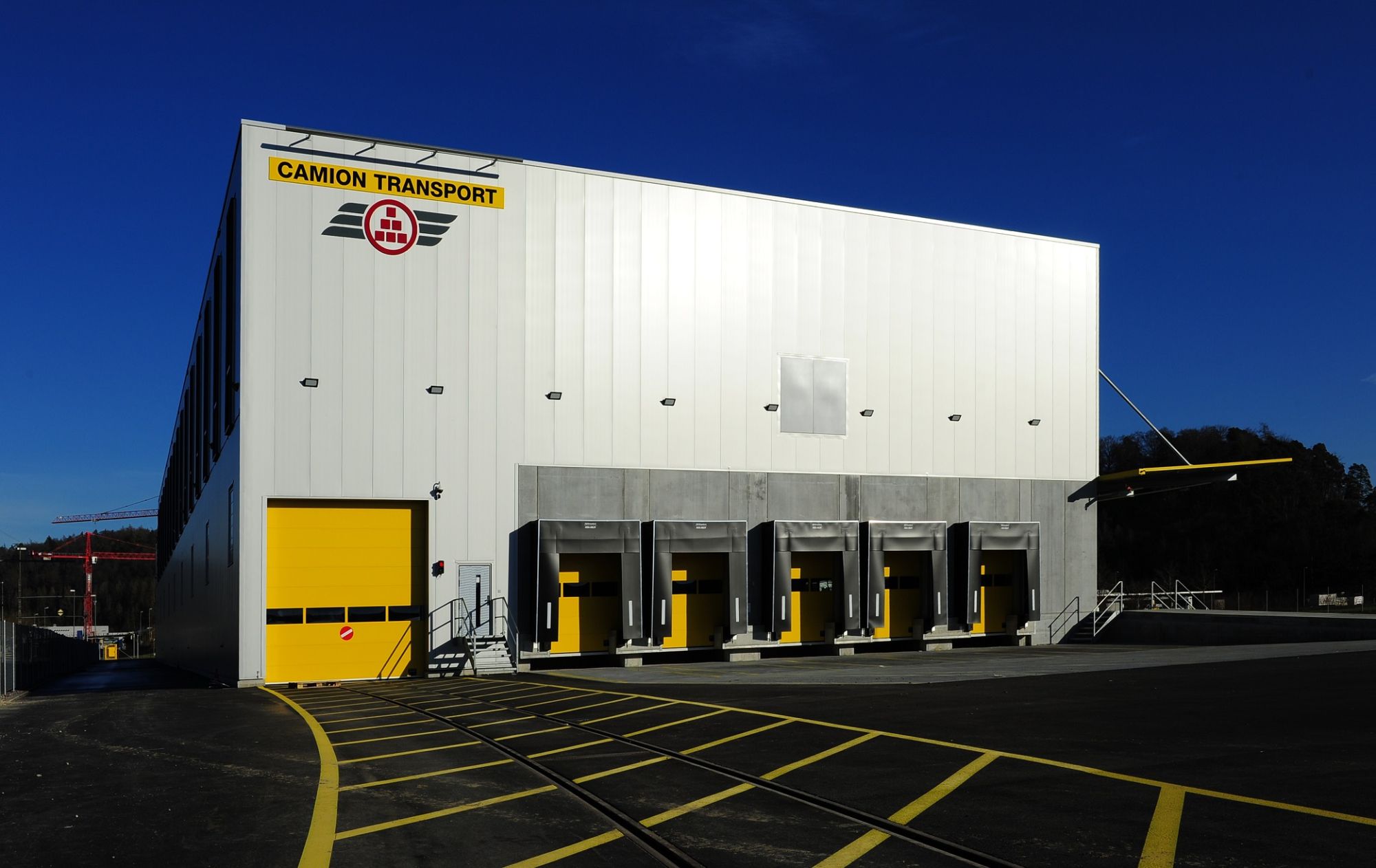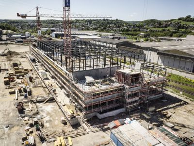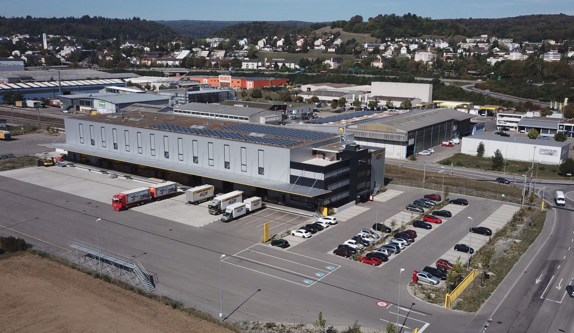 - Das Lager im OG mit einer Raumhöhe von 8.1 m besteht aus einem Tragsystem in Stahl und einer Sandwichfassade mit integrierten vertikalen Fensterbänder
